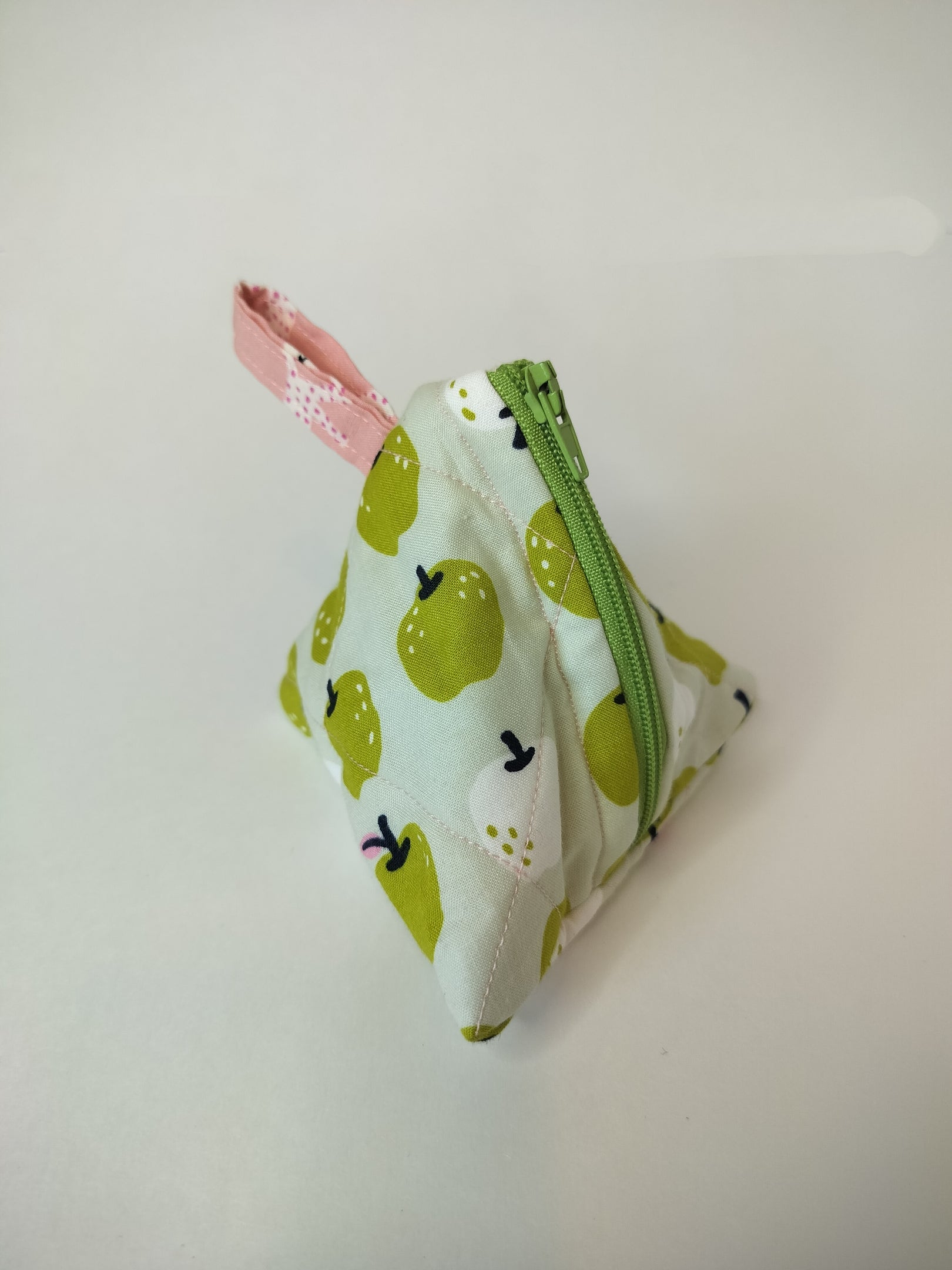 Get your paws on this Green Apple Bag! This triangular wonder sports a green apple exterior and a playful pink interior adorned with cute speckled cats. Versatile and compact at just 4 inches, it's perfect for storing dice, treats, or coins. (Meows not included)