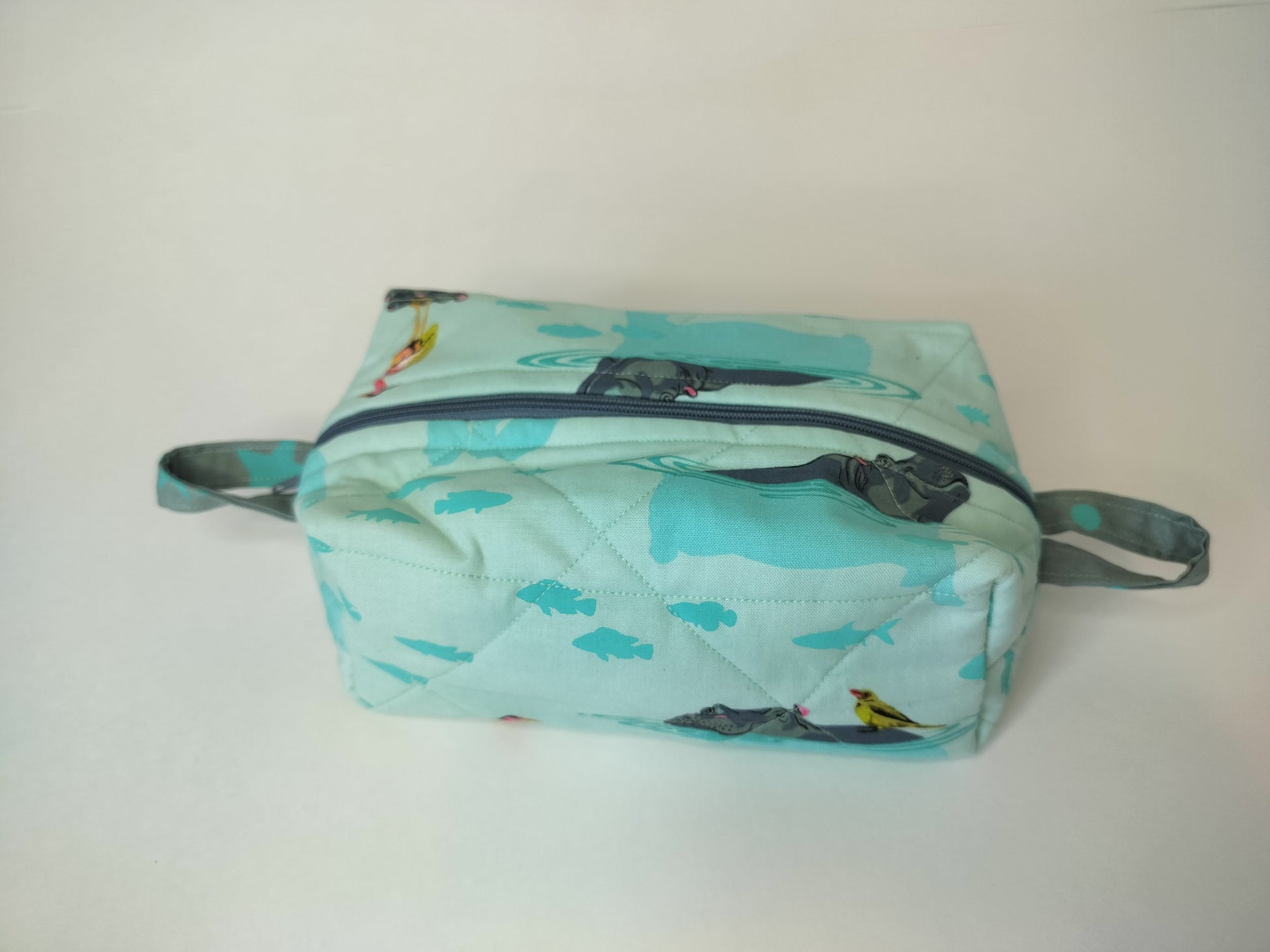 Take a swim on the wild side with our Hippo Quilted Box Bag! Made with a light teal fabric, this bag features playful hippos and fish swimming around the outside. Inside, a burst of dark teal adds a touch of excitement to the grey lining. Measuring at 3 by 4 by 7 inches, it's the perfect size for all your essentials.