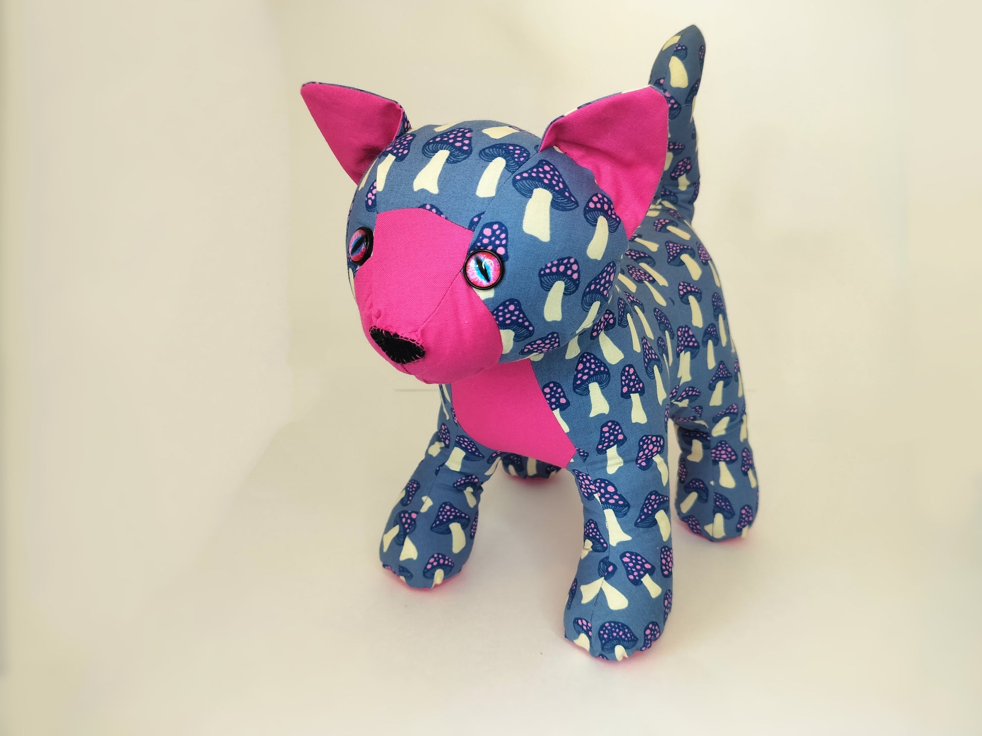 Introducing our Mushroom Cat Stuffed Animal, made from soft and cuddly blue mushroom fabric with hot pink accents. This 14 inch tall cutie features vibrant pink and blue safety cat eyes that sparkle with every hug. A whimsical addition to any stuffed animal collection!