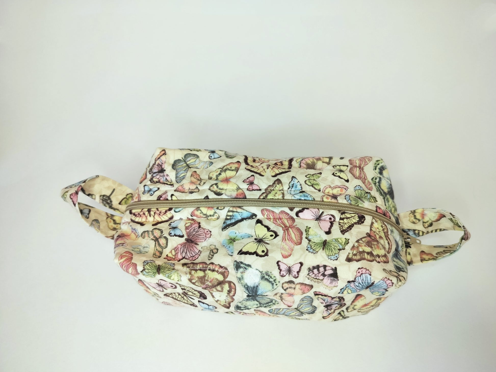 Fly away with this quirky Natural Butterfly Box Bag! With its natural and pastel toned butterflies adorning the outside and a light pink mini floral lining on the inside, this bag is sure to add a playful touch to any outfit. Measuring at 3 by 4 by 7 inches, it's the perfect size for all your essentials. Flutter your way to fashion with this unique bag!