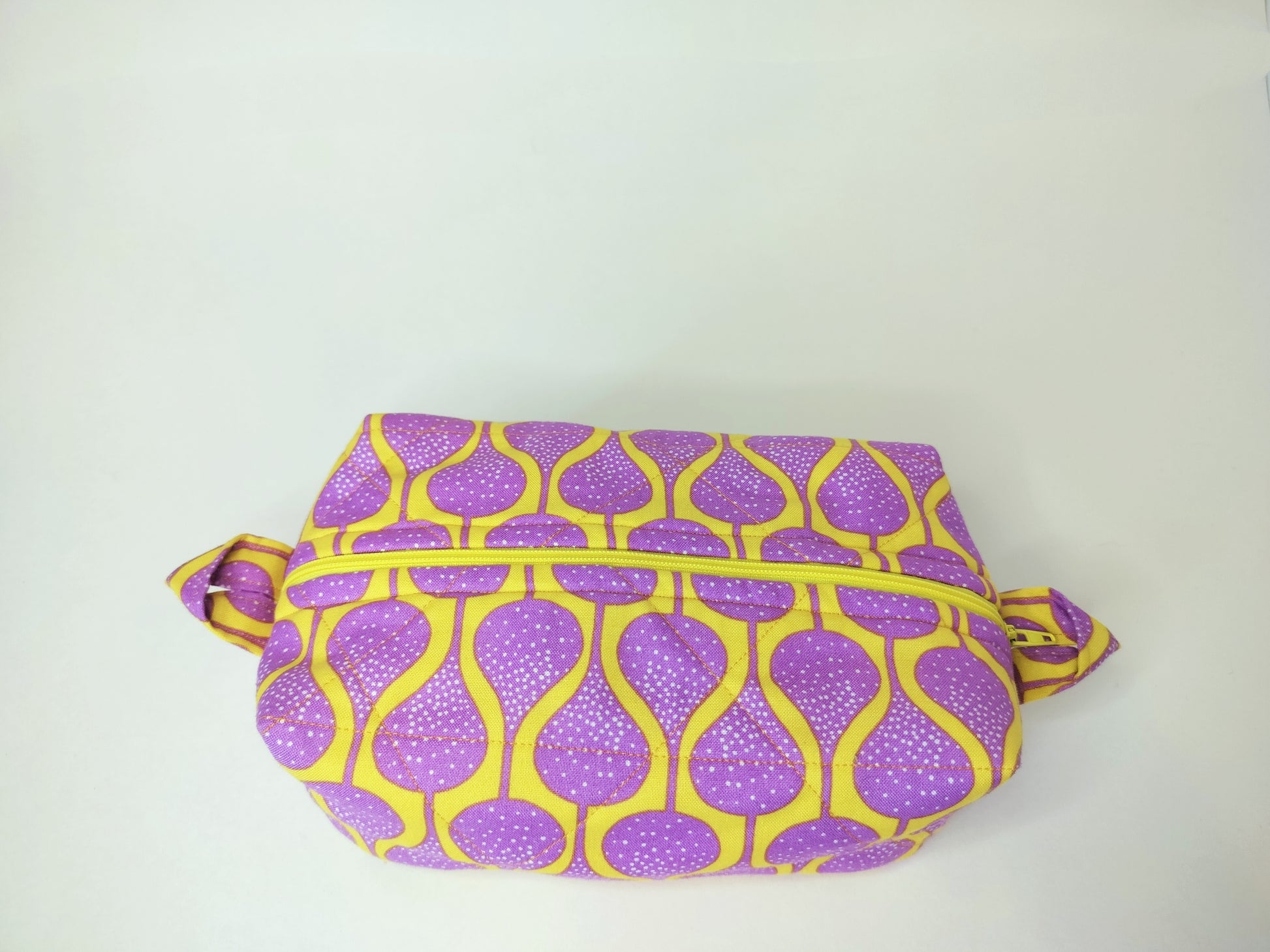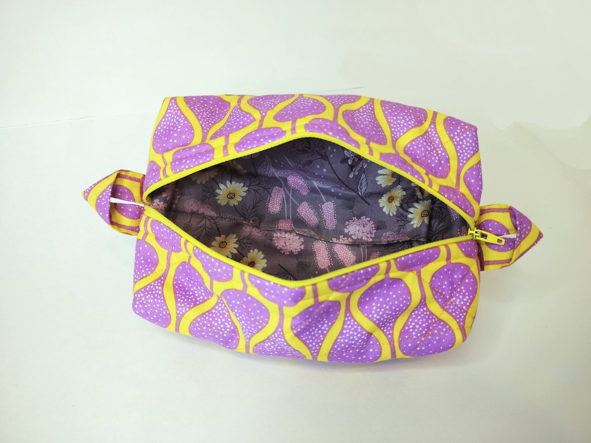 Introducing the Teardrop Quilted Box Bag. This unique bag features a playful yellow background adorned with abstract purple teardrops on the outside and a beautiful lavender floral print on the inside. Measuring 3 by 4 by 7 inches, it's the perfect quirky addition to your wardrobe.