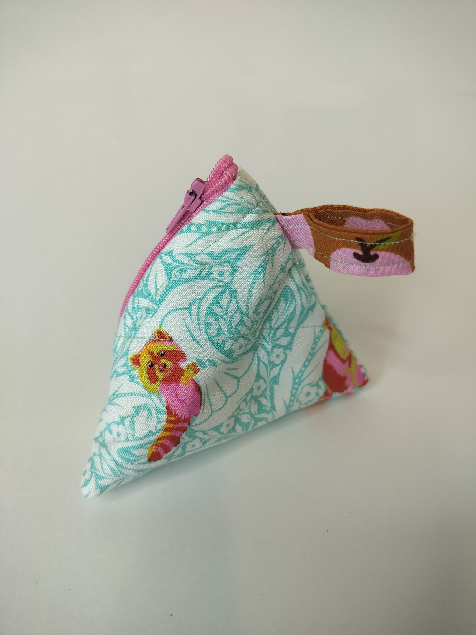 Fun meets function with the Trash Panda Bag - a playful twist on a classic design. This unique bag features a whimsical white and teal background adorned with bright yellow and pink racoons, and a surprise pink apple print on the inside. Its 4 inch triangle shape makes it the perfect statement piece for any outing.