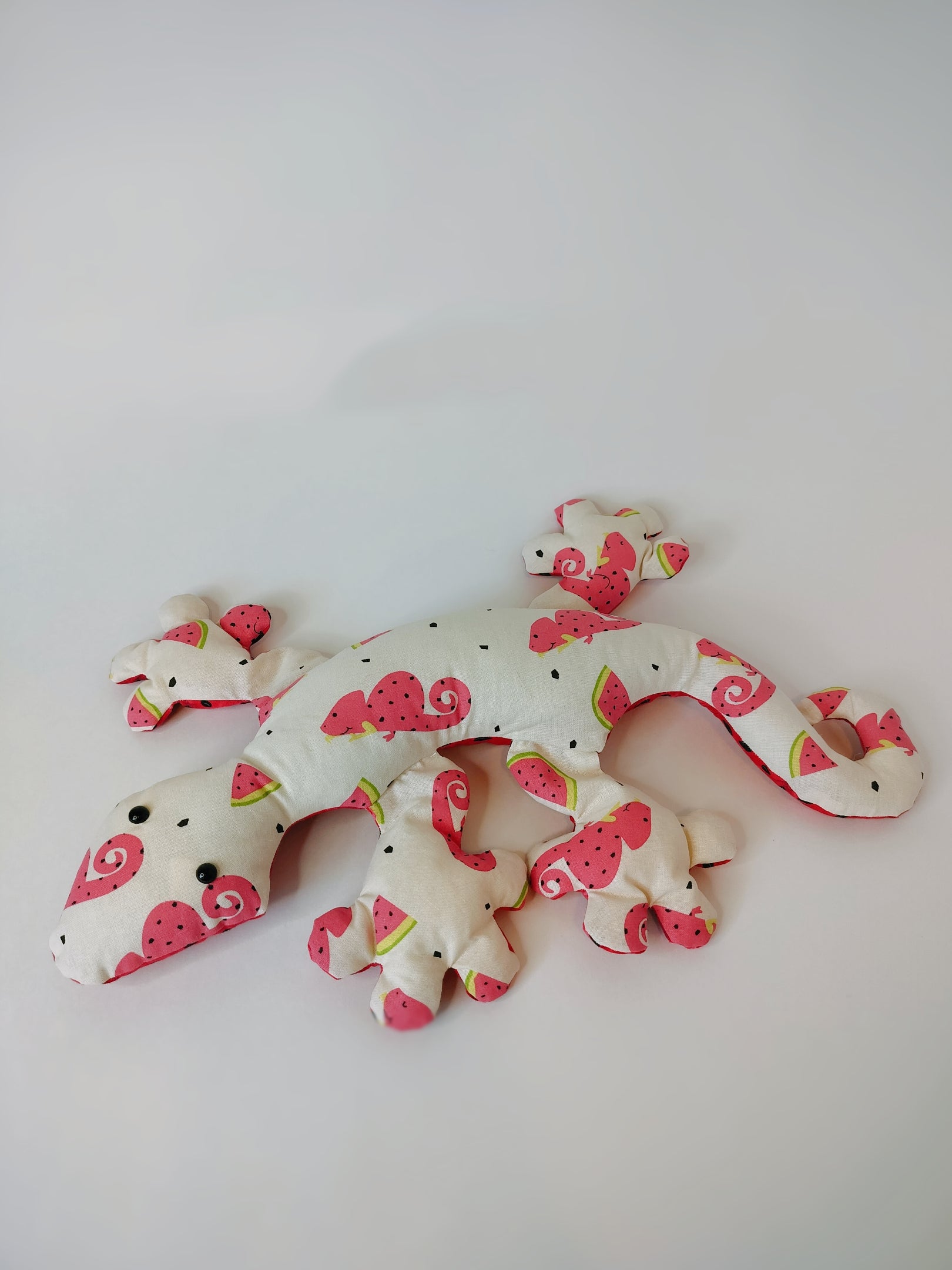 Get ready for some fruity fun with our Watermelon Gecko Stuffed Animal! Featuring a watermelon gecko print on top and watermelon fabric on the tummy, this quirky critter is 17 inches long and has just the right amount of weight in its arms and legs. Perfect for snuggles and playtime! Made using Funky Friends Factory pattern.